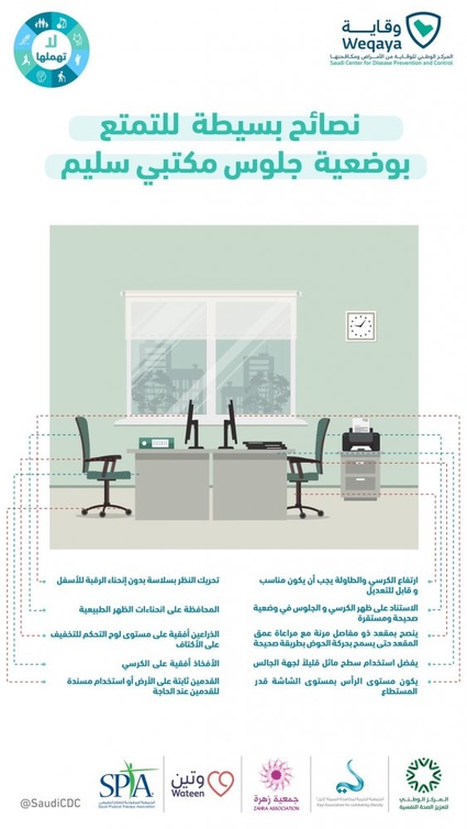 نصائح بسيطة للتمتع بوضعية جلوس مكتبي سليم #صحتك_لا_تهملها #وقاية pic.twitter.com/QjeUbuIohq