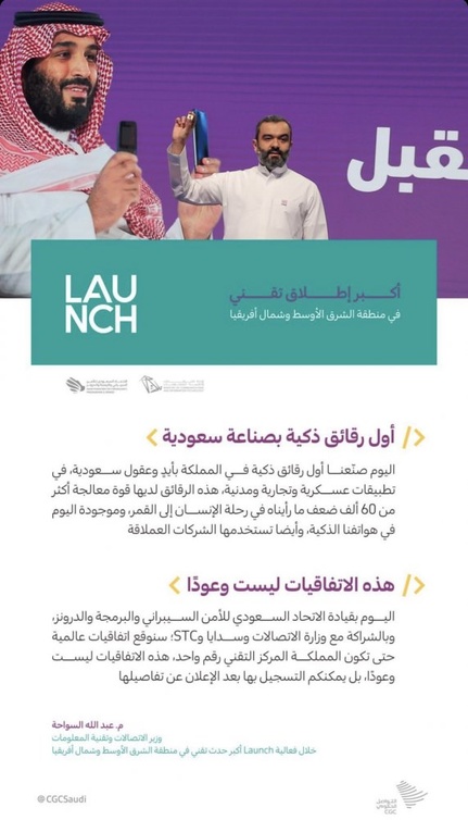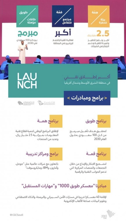 وخلال فعالية "Launch" أعلنت عدد من كبرى الشركات التقنية الرائدة في العالم؛ تتقدمها (جوجل، وأمازون، وIBM، وسيسكو، وأوراكل، ومايكروسوفت، وترند مايكرو، وافنسف سيكيور)، تعاونهم مع المملكة في “إطلاق برامجهم التدريبية “ومراكز تختص برفع القدرات الرقمية للكوادر الوطنية الشابة، ومراكز أخرى للابتكار في ريادة الأعمال التقنية.