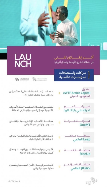 ومن بين الإعلانات المُهمة لفعالية Launch، الكشف عن صندوق eWTP Arabia Capital السعودي - الصيني، والذي يسعى إلى دعم الشركات التقنية الناشئة في المملكة برأس مال يقدّر بمليار ونصف ريال، بشراكة بين eWTp الصينية المدعومة من قبل شركة علي بابا وصندوق الاستثمارات العامة وبدعم من الاتحاد السعودي للأمن السيبراني والبرمجة والدرونز، بهدف الإسهام في دعم منظومة اقتصادية متينة للأعمال الرقمية في المملكة.