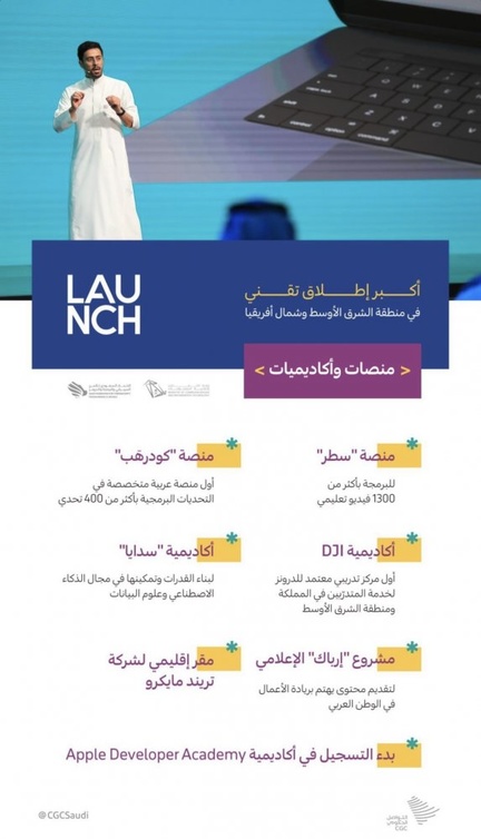 ومن بين الإعلانات التي شهدتها فعالية Launch، إطلاق "أكاديمية سدايا" لتسهم في بناء القدرات وتمكينها في مجال الذكاء الاصطناعي وعلوم البيانات، وإطلاق "منصة سطر" للبرمجة بأكثر من 1300 فيديو تعليمي، ومنصة "كودرهَب" أول منصة عربية متخصصة في التحديات البرمجية بأكثر من 400 تحدي، وتدشين منصة الدرونز الخاصة لخدمة مستخدمي الطائرات بدون طيّار داخل المملكة وقطاع الأعمال، إضافة إلى تدشين أكاديمية DJI أول مركز تدريبي معتمد للدرونز لخدمة المتدرّبين في المملكة ومنطقة الشرق الأوسط، وبالشراكة مع DJI Academy العالمية وstc. وبالإضافة إلى الإعلان عن شراكة مع شركة OneMT الرائدة في مجال صناعة الألعاب الإلكترونية، التي ستفتح ستوديو لها بالرياض، وإعلان شركة تريند مايكرو إنشاء مقرها الإقليمي في الرياض، وبدء التسجيل في أكاديمية Apple Developer Academy الأولى من نوعها بمنطقة الشرق الأوسط وشمال أفريقيا والمخصصة في مرحلتها الأولى للمبرمجات والمطورات، في مقرّها بجامعة الأميرة نورة بنت عبدالرحمن بالرياض، كما تم الإعلان عن مشروع "إرباك" الإعلامي بالتعاون مع مجموعة mbc و"ثمانية" للنشر والتوزيع برعاية من وزارة الاتصالات وتقنية المعلومات، بهدف تقديم محتوى يهتم بريادة الأعمال في الوطن العربي.