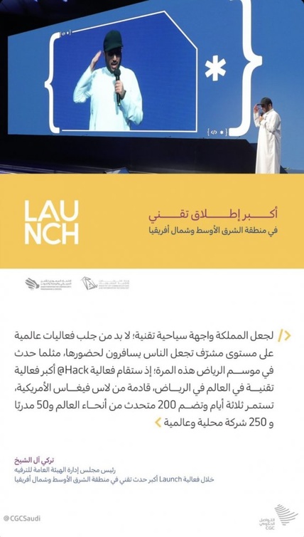 وخلال فعالية Launch أعلنت المملكة عن تنظيمها واحتضانها مؤتمر «Leap» العالمي العام المقبل، الذي يعد الحدث التقني الأضخم عالميًا والأول من نوعه في المنطقة، كما تم الإعلان عن استضافتها لقمة RiseUp الرياض، الأكبر من نوعها بمنطقة الشرق الأوسط وشمال أفريقيا لروّاد الأعمال والشركات الناشئة، وتم الإعلان أيضًا عن تفاصيل مؤتمر @Hack العالمي الأضخم في مجال الأمن السيبراني ضمن فعاليات موسم الرياض، بشراكة بين الهيئة العامة للترفيه والاتحاد السعودي للأمن السيبراني والبرمجة والدرونز، مع Informatech وBlack Hat للتصدي للمخاطر السيبرانية حول العالم، عبر استضافة خبراء Offensive Security للتدريب في أمن المعلومات، مع استضافة أكبر تحدي من نوعه بمنطقة الشرق الأوسط وشمال أفريقيا.