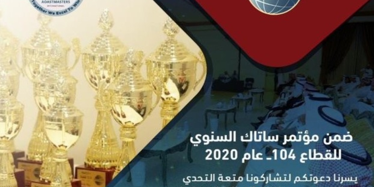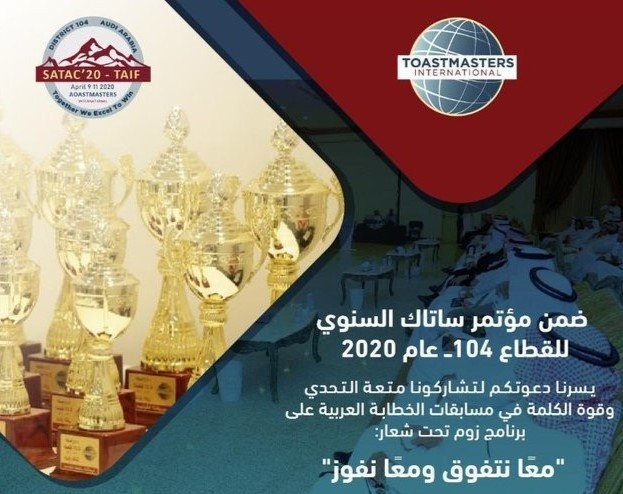 أعلن القطاع 104 للتوستماسترز بالمملكة العربية السعودية عن موعد مسابقته السنوية (ساتاك) 2020 والتي ستقام عبر الاتصال الافتراضي لأول مرة.