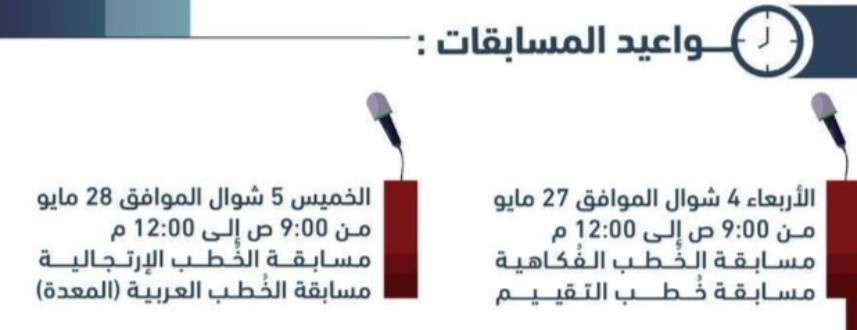 - مسابقة الخطب العربية (المعدة) ومسابقة الخطب الارتجالية، والتي ستقام يوم الخميس 28 مايو الجاري، حيث رابط التسجيل لليوم الثاني.