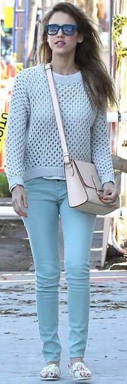 ليست إطلالة واحدة، ولا اثنتين، بل ثلاث إطلالات بنفس السترة الشبيكية الأنيقة، أما الفارق ففي التفاصيل، النجمة Jessica Alba اختارت أن تقرن هذه السترة ببنطلون جينز بلون النعناع الأخضر، وحقيبة بيضاء من Joy Gryson، وحذاء أرضي خفيف مزين بالورود.
