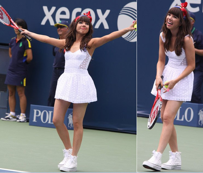 يبدو أن Carly Rae Jepsen كانت تلميذة شقية ومرحة فقد حرصت على أن تستكمل إطلالتها المذهلة أثناء حضورها احتفال the 2012 Arthur Ashe Kids’ Day مع هذا الفستان القصير الرائع بايشارب مشجر بالألوان الزرقاء والحمراء مع مضرب للتنس باللون الأحمر مع زوج من الأحذية الرياضية باللون الأبيض أيضا واكتفت بخاتم بفص أحمر كبير .