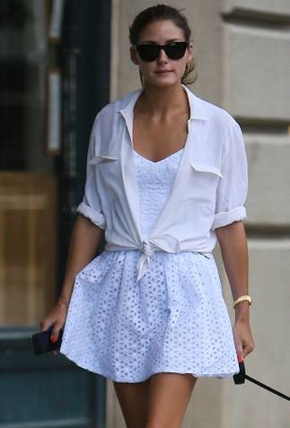 النجمة Olivia Palermo لم تتحمل كل هذه الشقاوة والإثارة فظهرت بالفستان نفسه فى جولة بمدينة نيويورك رومانسية ولكن جادة حيث أضافت بلوزة باللون الأبيض وحذاء خفيف باللون البيج ونظارة شمس .