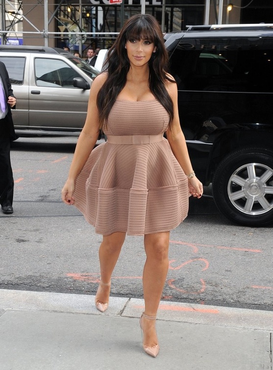 أما الثانية فكانت نجمة تليفزيون الواقع الشهيرة Kim Kardashian والتي ارتدت نفس الفستان أخيراً أثناء تجولها في مدينة نيويورك، واحتفظت Kim أيضاً بنفس الحزام وانتعلت حذاء من نفس اللون، وبدت التنورة المنفوشة أكثر وضوحاً عليها، خاصة مع زيادة وزنها بسبب الحمل.