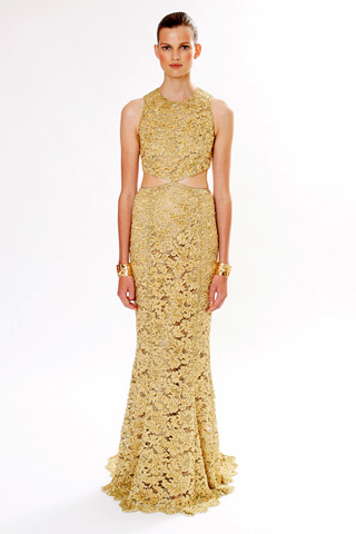 تألقت به النجمة Emily Blunt أولاً في حفل Golden Globe Awards يناير الماضي، واختارت منه النسخة الذهبية الأصلية، ولكنها أضافت له بعض المجوهرات الحمراء من الأحجار الكريمة، وتحديداً الأقراط وأسورة اليد، إنه أحد إبداعات Michael Kors من مجموعة Resort 2013.