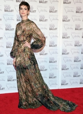 النجمة  آن هاثاواي  حافظت على قصة شعرها المثيرة  و ارتدت ثوب رائع من الأزهار المطبوعة من مجموعة الأزياء الراقية 2012 Valentino Couture collection.