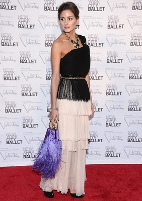 أوليفيا باليرمو تألقت مع بلوزة سوداء وتنورة بيضاء من ابداعات كريستيان ديور وأضافت الكثير من الإكسسوارات مثل حقيبة الريش البنفسجى والعقد الذهبى المرصع بالأحجار السوداء وحزام صغير من جلد الثعبان .