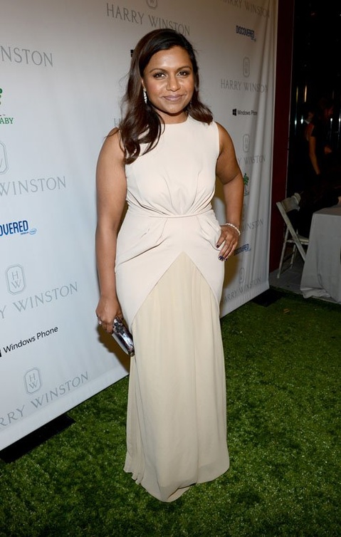المتألقة Mindy Kaling اختارت لإطلالتها فستانًا ورديًًا فاتحًا من Max Mara بلا أكمام بتنورة من الشيفون ، واستكملت إطلالتها بمجوهرات فضية وحقيبة من جلد الثعبان وطلاء الأظافر الأزرق وأحمر شفاه أرجواني .
