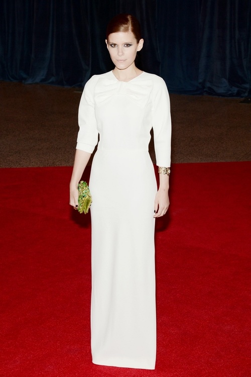 من جهتها، انتقت كيت مارا فستانا أبيض محتشما جدا، وبسيطا للغاية بدت فيه كالملاك الأبيض، وأضفت عليه بعض الحيوية بحمل clutch باللون الفوسفوي ووضع سوار ذهبي في معصمها.