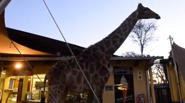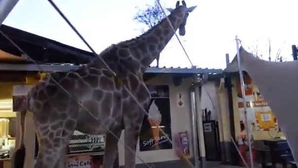 ودخلت الزرافة التي يبلغ طولها 20 قدماً وهي تتجول غير مبالية لوجود الرواد في مطعم حديقة الحيوان المفتوحة، وتوقفت الزرافة لفترة وجيزة، لكنها لم تتناول أو تشرب شيئاً ثم شقت طريقها عائدة من حيث أتت.