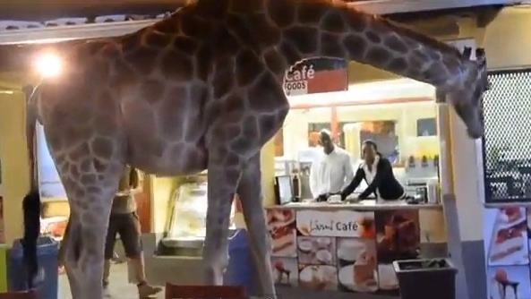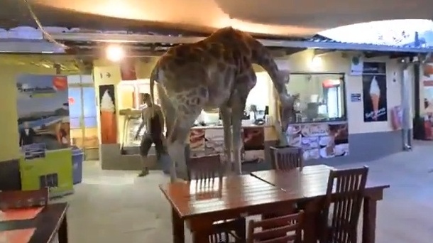 أصابت حالة من هستيريا الضحك رواد حديقة الحيوان المفتوحة "ليون بارك" في جوهانسبرج، بعد أن دخلت عليهم زرافة في مطعم الحديقة، وهي تتجول غير مبالية لوجودهم.