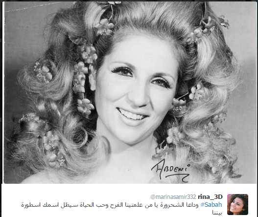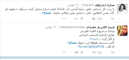وأيضا من تغريدات اللبنانين في نعي شحرورتهم :"جميلة هي الأرواح التي تأتي لإسعادنا وحتى بعد رحيلها تستمر السعاده، شكراً للـ #الشحروره_صباح على هذا الفن الجميل"، "عاشت وماتت زي العسل"، "اليوم ودعناك جسدا أما روحك فهي باقية بأغانيك وبما علمتنا من حب الحياة والفرح".