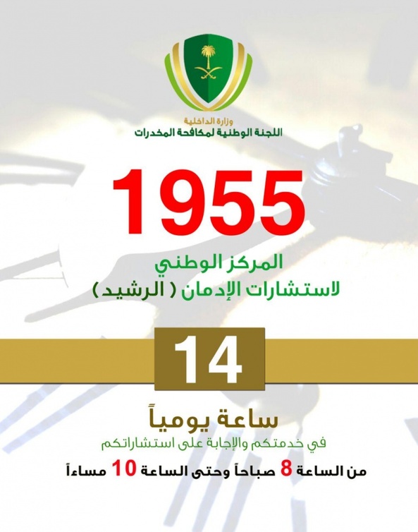 في إطار ذلك تم تدشين الرقم الموحد لمركز استشارات الإدمان 1955، والذي يعنى بتخصيص هاتف متخصص في استشارات تعاطي المواد المخدرة والمؤثرات والعقلية ومباشرة طلب التدخل المباشر في مساعدة الأسر المتضررة من مريض الإدمان وتقديم العلاج القسري له بتحويله للمصحات العلاجية المتخصصة، وفقا لما أعلنه أمين عام اللجنة الوطنية لمكافحة المخدرات عبدالاله الشريف.