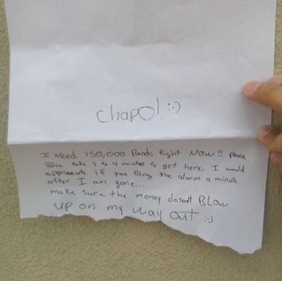 وذكرت تقارير صحافية أميركية أن دومينيك ألفونيسكا البالغ من العمر 23 عاما اقتحم المصرف وتوجه إلى الموظفة عارضاً عليها رسالة جاء فيها إنه يريد مبلغ 150 ألف دولار، طالباً منها عدم الاتصال بالشرطة إلا بعد فراره بدقيقة واحدة. وختم الشاب رسالته التي تضمنت عبارات شكر وامتنان، بجملة ساخرة ووجه تعبيري مبتسم قائلاً: "تأكدي من أن الأموال التي بحوزتي لن تنفجر أثناء خروجي من المصرف".