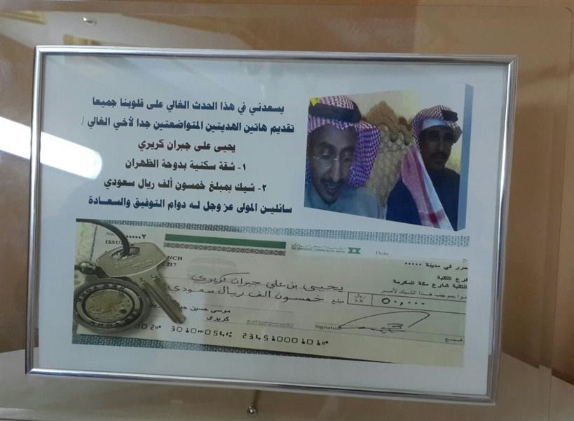 علماً بأن السيارة لم تكن هي الهدية الوحيدة التي حصل عليها المعلم المتقاعد، بل فاجأه شقيقه أيضاً بإهدائه هدية مماثلة عبارة عن شقة سكنية بحي الدوحة في مدينة الظهران، وشيك بمبلغ مالي قدره 50 ألف ريال.