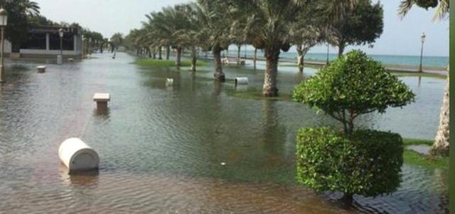 غمرت مياه البحر، حديقة كورنيش مدينة كلباء بإمارة الشارقة، نتيجة ارتفاع الموج، بسبب بدء تأثير العاصفة المدارية آشوبا على بحر العرب وشواطئ سلطنة عمان، الذي نتج عنه هيجان موج البحر وارتفاعه، وغمر مساحات كبيرة من الكورنيش بالمياه.