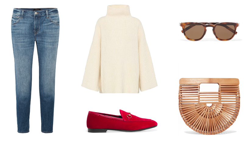 لاطلالاتك الكاجوال بأسلوب عملي، اخترنا لك حذاء بقصّة الـLoafer الأنيقة باللون الأحمر من “غوتشي” Gucci، ونسّقنا معه توب صوفي بقبّة عالية وقصّة واسعة ومريحة باللون الأبيض العاجي من “ذا رو” The Row، وجينز أزرق شبابي بقصّة مستقيمة من “جاي براند” J Brand، وأضفنا لمسة ملفتة بحقيبة فريدة ومميّزة من “كالت غايا” Cult Gaia، مع نظارات شمسية أنيقة من “سان لوران” Saint Laurent.