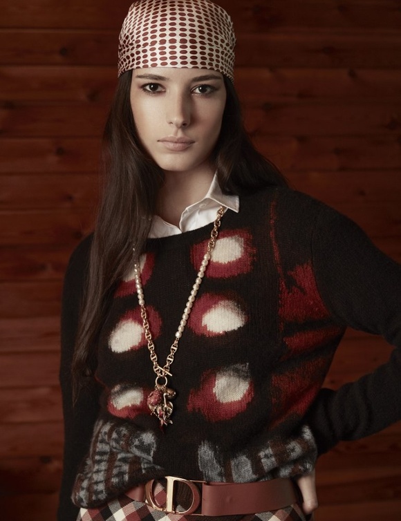 تنورة من الصوف المطبع بالمربعات، وقميص قطني أبيض، وكنزة مصبوغة بتقنية القماش المربوط، وحزام بلون أسمر داكن ذو شعار CD، وعقد طويل، ووشاح حريري منقط.