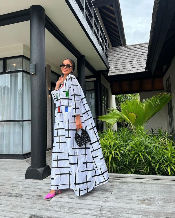 لوك ناعم وأنثوي نسقته فاطمة حسام وقد اختارت فيه فستان ماكسي بقصة واسعة ومنسدلة باللون الزهري مطرز بخيوط ملونة، واختارت معه صندل كعب عالي مزين بالأربطة وحقيبة يد لها سلسلة معدنية كلاهما باللون الفوشيا.