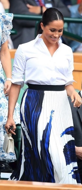 والبارز أن الأميرة ميغان ماركل Meghan Markle اختارت القميص الأبيض أثناء الحمل وتألقت بها بأسلوب راقي مع التنورة السوداء الطويلة ذات الخصر العالي. فبدت في غاية الجاذبية والتميّز بهذه التصاميم الساحرة. كما لفتت الأميرة ميغان ماركل Meghan Markle الأنظار بعد الولادة، من خلال تنسيق القميص الأبيض مع التنورة المكسّرة بأقمشة البليسيه والمزخرفة بنقشات ملونة لجعل إطلالتها في غاية الأناقة والتميّز.