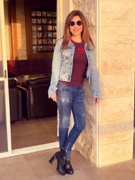 وفي لوك كاجول، نسّقت نجوى كرم الجاكيت الجينز باللون الفاتح مع تيشيرت برغندي وسروال جينز وبوت أسود.