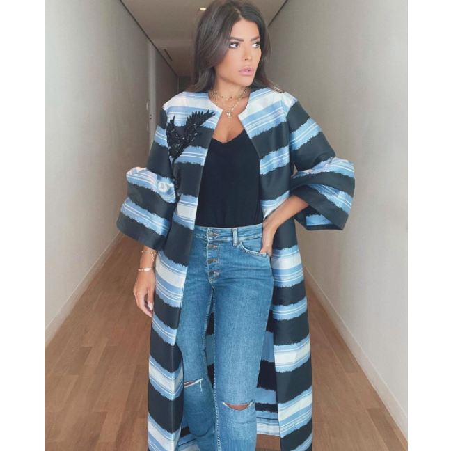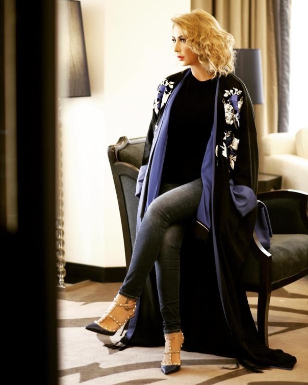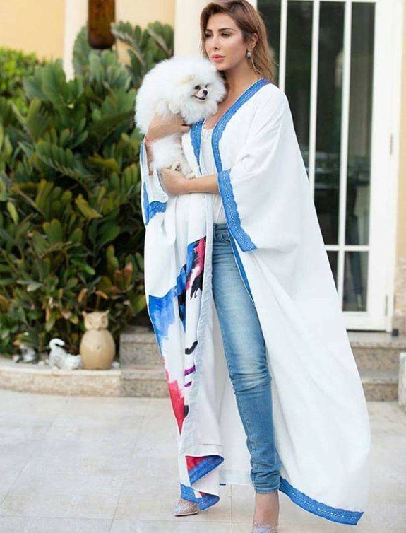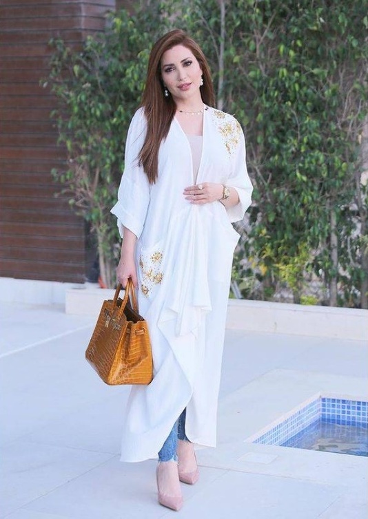 العنود البدر تألقت في أحدث صورها على إنستقرام بصيحة تنسيق موضة القفطان مع السروال الدنيم، وقد تألقت بالعباية الأنيقة من تصميم مرمر حليم بنقشة المقلّم بدرجات اللون الأزرق من الداكن إلى الفاتح، نسّقت تحتها التوب الأسود والبنطلون الدنيم الممزق عند الركبتين وبقصة الخصر العالي للوك أنيق وعصريّ. كما نسّقت القفطان الأبيض المزيّن بالورود الزرقاء والذي تميّز بأكمامه الشفافة والتطريز الذهبي مع البنطلون الدنيم.