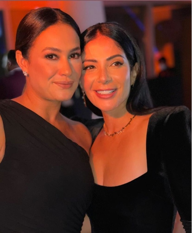 منى زكي نشرت كذلك صورة عبر خاصية "الاستوري" تجمعها بالفنانة هند صبري التي  تألقت هي الأخرى بفستان اسود قصير ضيق يبرز قوامها الرشيق بقصة الكتف الواحد الذي يلتصق به من الناحية الخلفية قماش مثني ومنسدل على شكل ذيل اطول من الفستان، واختارت مع اطلالتها تسريحة ذيل الحصان.