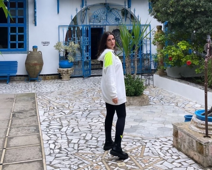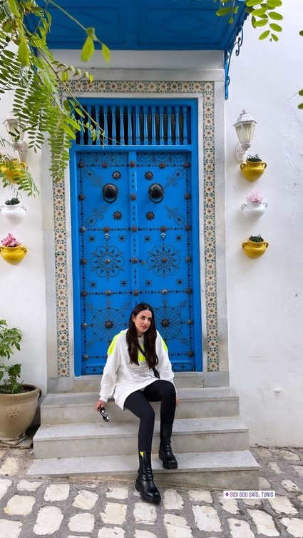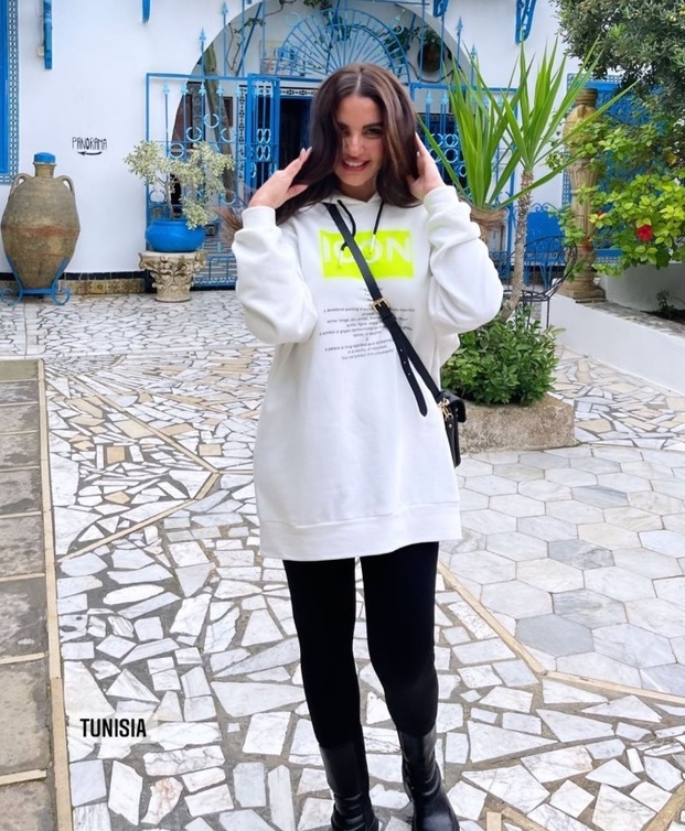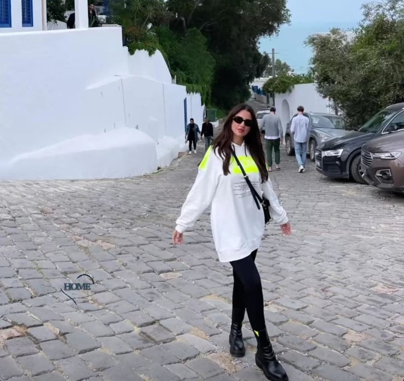 درة نشرت عبر خاصية "الاستوري" عبر حسابها على "انستجرام" أكثر من صورة ظهرت فيها بإطلالة شابية كاجوال وعصرية أثناء تواجدها في تونس، واختارت الفنانة التونسية بنطلون أسود ضيق "ليغنغ" أظهر قامتها الرشيقة، ونسقته بأسلوب حيوي مع "سويت شيرت" فضفاض طويل باللون الأبيض المطبوع ببعض العبارات مع الخلفية باللون الأخضر الفسفوري الجريء، وأكملت إطلالتها بحذاء جلدي مسطح ومريح مزين في الأعلى بجزء بسيط بنفس اللون الأخضر.