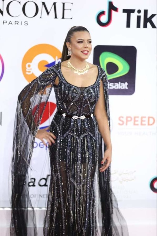 ريهام عبد الغفور أبهرت جمهورها بإطلالتها على السجادة الحمراء، حيث تألقت الفنانة المصرية بفستان أسود طويل تميز بقصة ضيقة غير متوازية حيث صمم من جانب بقماش أسود متداخل بأسلوب حيوي ملفت للنظر مع قماش مرصع بالكامل بالكش اللامع بتدرجات اللون الموف من الجانب الآخر، كما صمم الفستان بياقة عالية وشق في منتصفه زاد إطلالتها أنوثة وجاذبية.