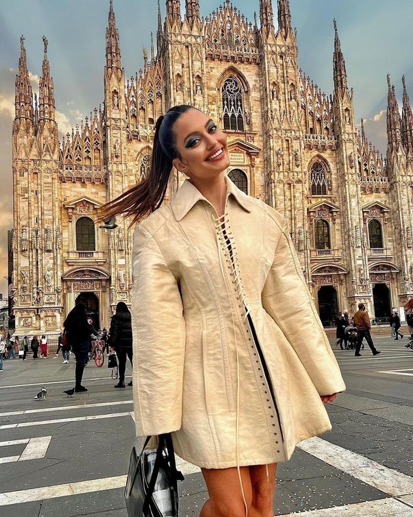 ومن اجمل اطلالات متابعات الموضة في ميلانو، اختيار كارن وازن موضة المعطف الجلدي البيج بتدرجاته الفاتحة مع الرباط الامامي والفراغات الهندسية المستقيمة مع الحبال المنسدلة بطريقة متججدة في عالم الموضة. وفي اطلالة ثانية لها، اختارت كارن وازن موضة البلايزر المستقيمة بنقشات هندسية بارزة وقصيرة بطريقة ملفتة على شكل فستان. كما سحرتنا اطلالة Leonie Hanne بموضة البنطلون الازرق السماوي مع الريش الهندسي المنسدل بأسلوب عصري، ونسّقته مع الكروب توب السوداء وموضة الجاكيت الفضفاضة باكمام الريش ايضاً لضمان أناقة مميزة. وأبهرت Chiara Ferragni شوارع ميلانو بتألقها بموضة التنورة الصفراء القصيرة مع الجاكيت الجلدية السوداء الفاخرة بطريقة خارجة عن المألوف.