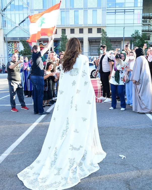 نجوى كرم خطفت أيضا الأنظار قبل حفلها في الأردن وظهرت بإطلالة ناعمة حيث ارتدت الفنانة اللبنانية بنطلون أبيض بقصة الخصر العالي والأرجل الواسعة نسقته بشكل فخم مع بلوزة بيضاء بأكمام طويلة واسعة ومزينة بنقاط بيضاء، والملفت في إطلالة نجوى هو الوشاح الذي ارتدته والذي يشبه الكاب القصير من الأمام وقد صمم على شكل ذيل طويل من الخلف ومزين بتطريزات ذهبية زادت إطلالتها أناقة وفخامة.