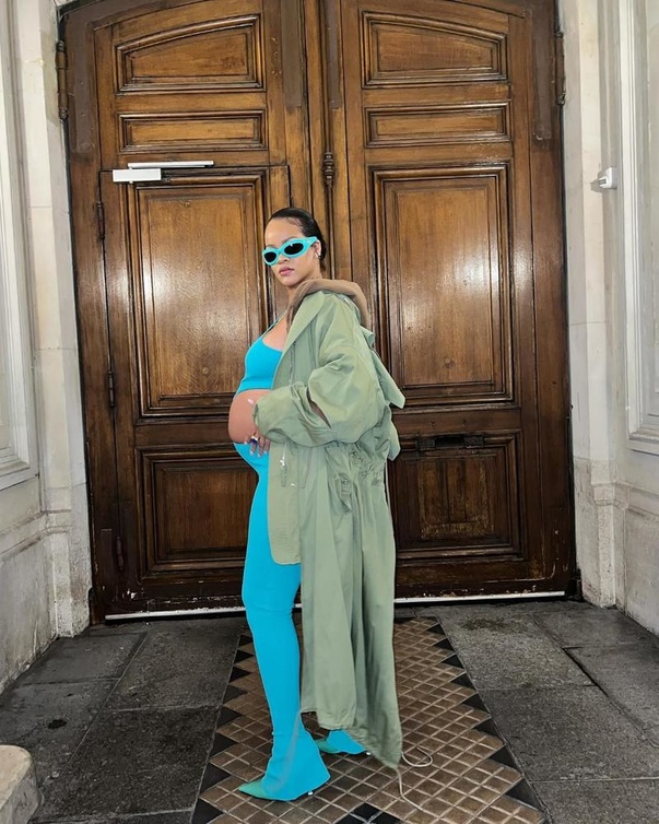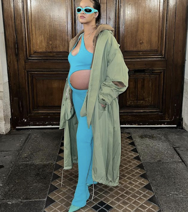 خطفت ريهانا الأنظار بإطلالة أخرى، لكن بستايل مثير وجذاب عبارة عن جمبسوت باللون الأزرق من Savage X Fenty، لكن بتصميم مختلف، جاء بقصة غير متوازية على الأكتاف، وبعض التفاصيل الأخرى التي أظهرت علامات حملها بشكل واضح، نسقت معه جاكيت طويل باللون الأخضر، وحذاء بنفس لون الجمبسوت من The Attico، وكانت اكسسواراتها عبارة عن نظارة مرحة باللونين الأزرق والأسود من غوتشي Gucci.