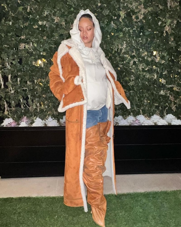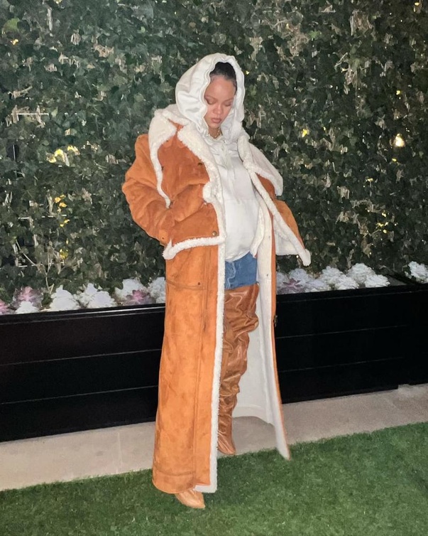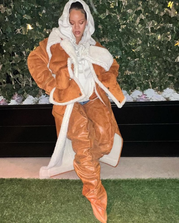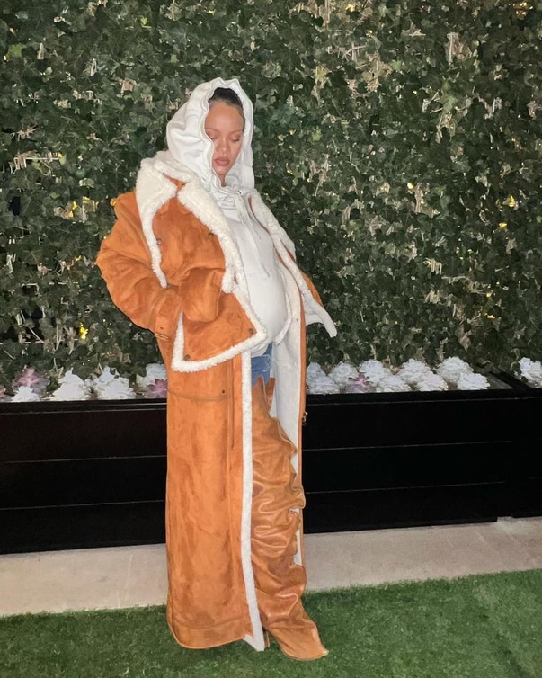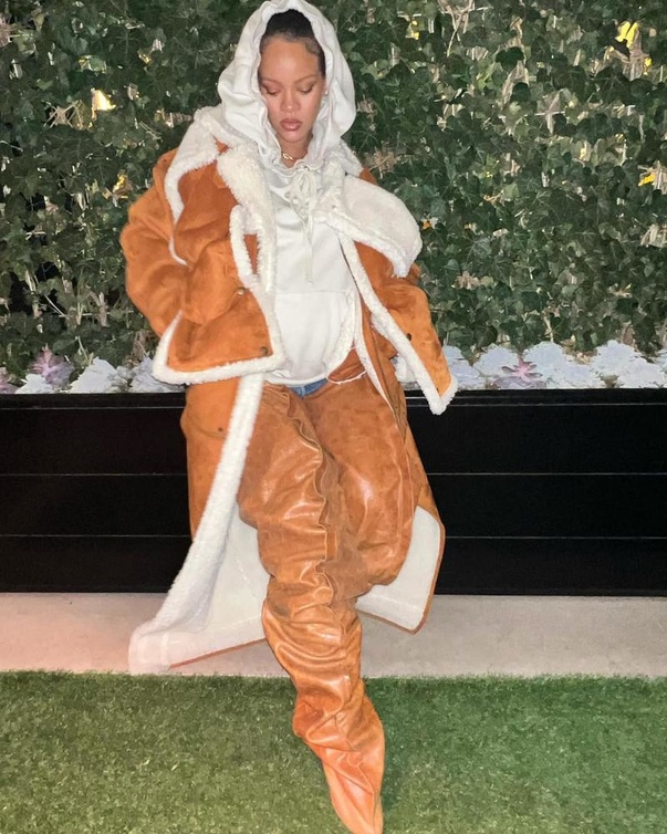 في أحدث إطلالة لها خلال فترة حملها، أطلت ريهانا بستايل ملفت باللون من Y/Project، عبارة عن بنطال جلد واسع ومعطف طويل باللون البيج، نسقت معه بلوزة بيضاء مع غطاء رأس باللون الأبيض، وكان تصميم الستايل مناسب جدًا حيث كان واسعًا وفضفاضًا مما يعطي إحساسًا بالراحة والأناقة والتميز، وشاركت ريهانا تلك الإطلالة بثقة وتألق من خلال عدة صور عبر حسابها بإنستجرام، واستعرضت ريهانا من خلالها هذا اللوك المميز.