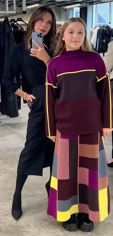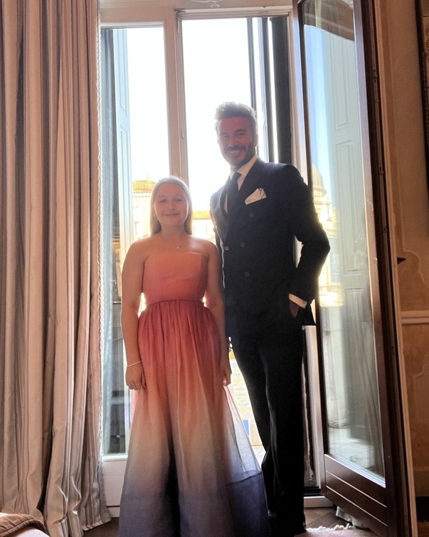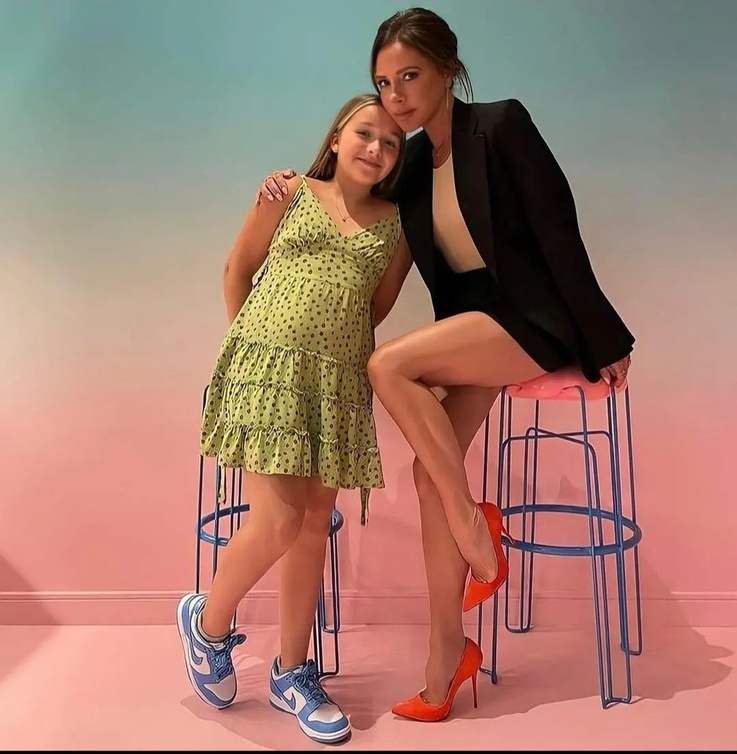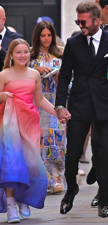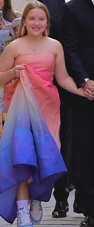 هاربر سيفن بيكهام ابنة نجم كرة القدم العالمي ديفيد بيكهام والنجمة الشهيرة فيكتوريا بيكهام، تعتبر واحدة من أبرز بنات النجوم والمشاهير اللواتي يحرصن على مرافقة والديها في العديد من الفعاليات الخاصة بالموضة والفن، وبالرغم من صغر سن الطفلة التي تبلغ 11 عامًا فقط، إلا أنها على ما يبدو أنها تحب اتباع أحدث صيحات الموضة مع كل ظهور لها، حتى وإن تسبب ذلك في ظهورها بشكل أكبر من عمرها، وهو ما حدث مؤخرًا عندما ارتدت فستانًا بدون أكتاف وبألوان ناعمة ومختلفة منها الأحمر والبرتقالي والوردي عند الجزء العلوي، مع تمركز اللون الأحمر الغامق عند منطقة الخصر، في حين انسدل الجزء السفلي بانسيابية وأناقة مع تدرج الألوان، والتي تشمل الأزرق والثلجي والأبيض، كما اختارت أن ترتدي حذاء رياضي على تلك الإطلالة اللافتة.