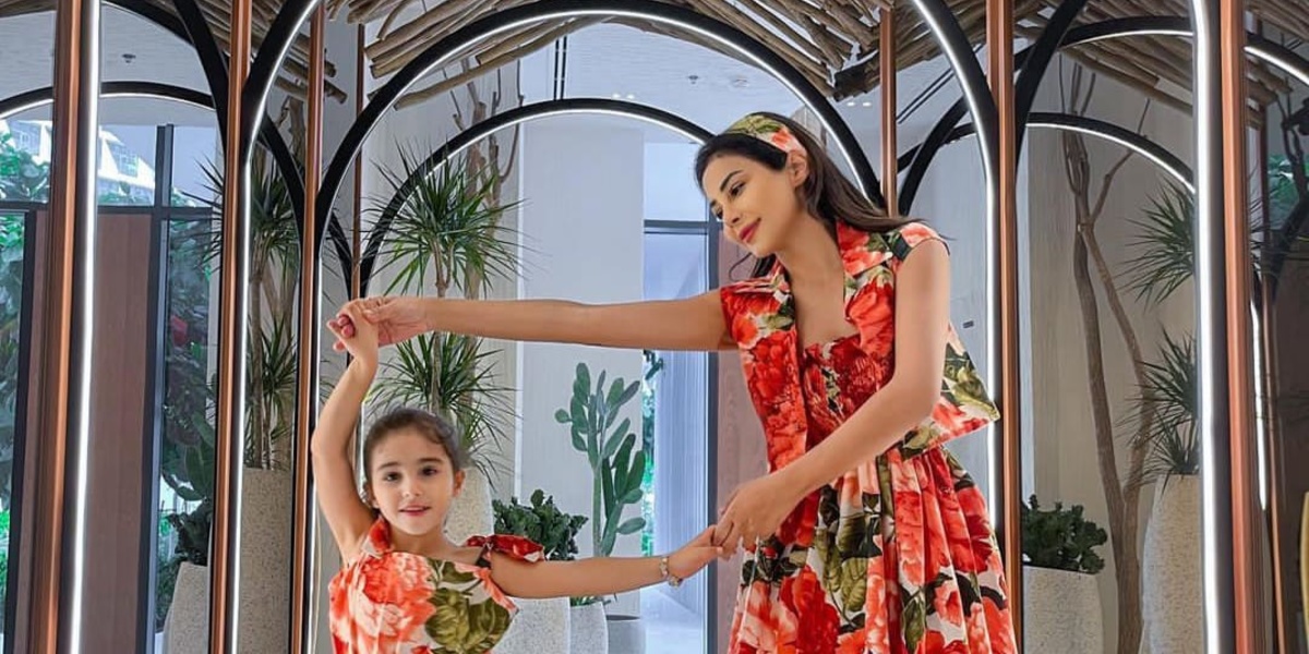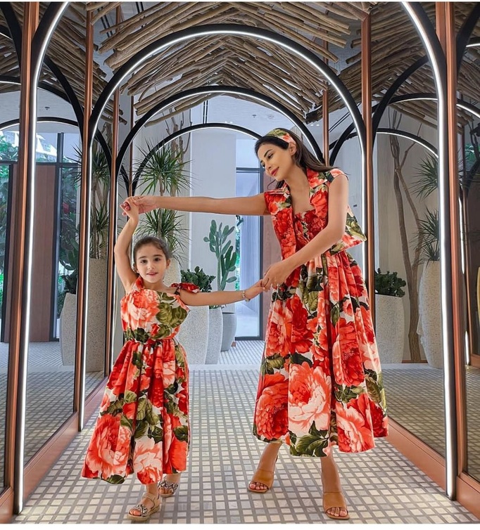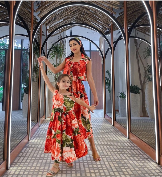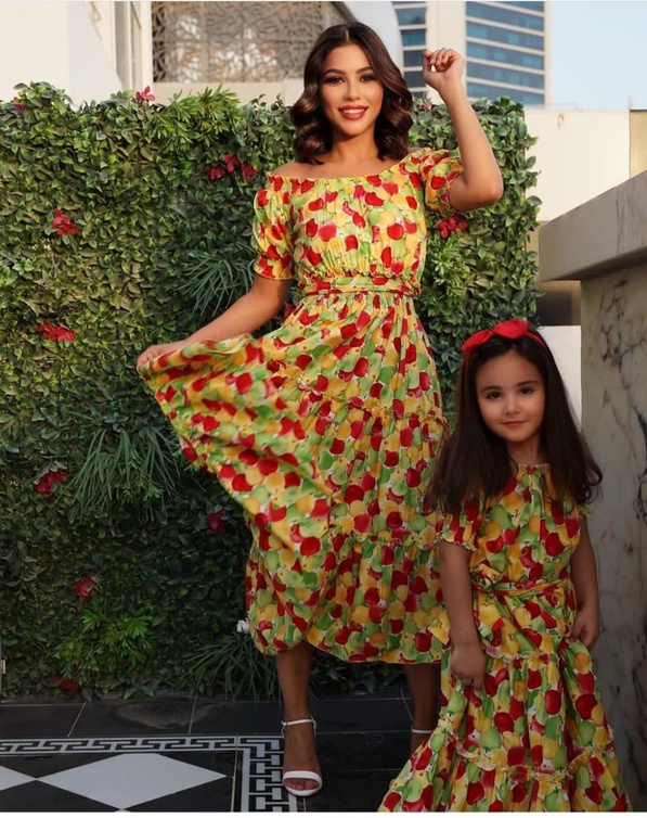 مهيرة عبد العزيز من أكثر النجمات التي تعتمد إطلالات متشابهة مع ابنتها، حيث أطلت معها في أكثر من مناسبة بإطلالة متطابقة خطفت الأنظار، أبرزها إطلالة مبهجة بفستان أنيق بستايل مطبع بالأزهار، بتصميم بسيط مع تنورة طويلة واسعة، وحزام رفيع من الوسط، ونسقت مهيرة عبد العزيز مع إطلالتها ربطة شعر جذابة بنفس لون الفستان.