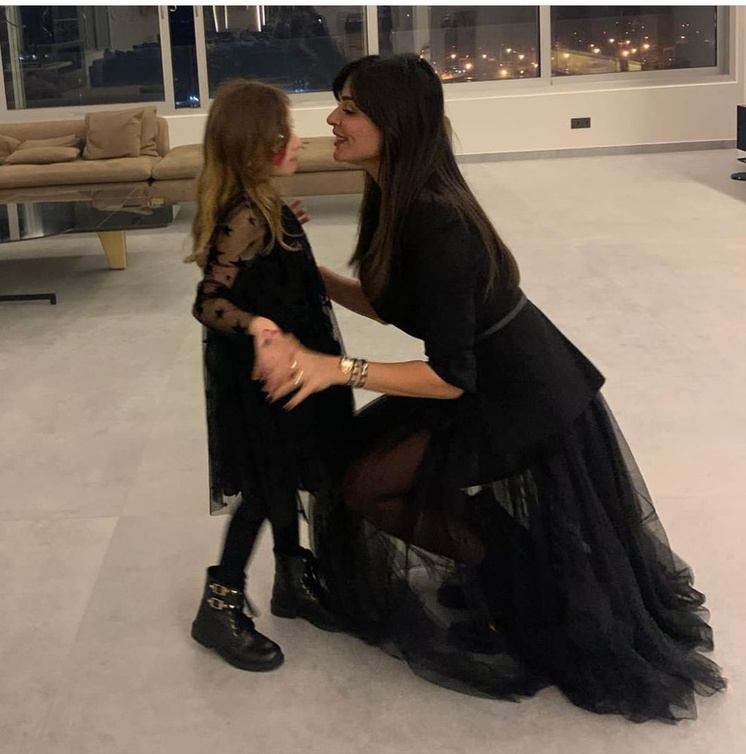 النجمة اللبنانية نادين نسيب نجيم أطلت مع ابنتها بإطلالة متطابقة بفستان باللون الأسود، بتصميم رقيق عبارة عن تنورة شيفون من عدة طبقات وتصميم مغلق عند الجزء العلوي مع أكمام طويلة، ونسقت كل من نادين نسيب نجيم وابنتها حذاءً متطابقًا بنفس لون الإطلالة، في حين كانت إطلالة نادين نجيم مميزة بحزام من الوسط.