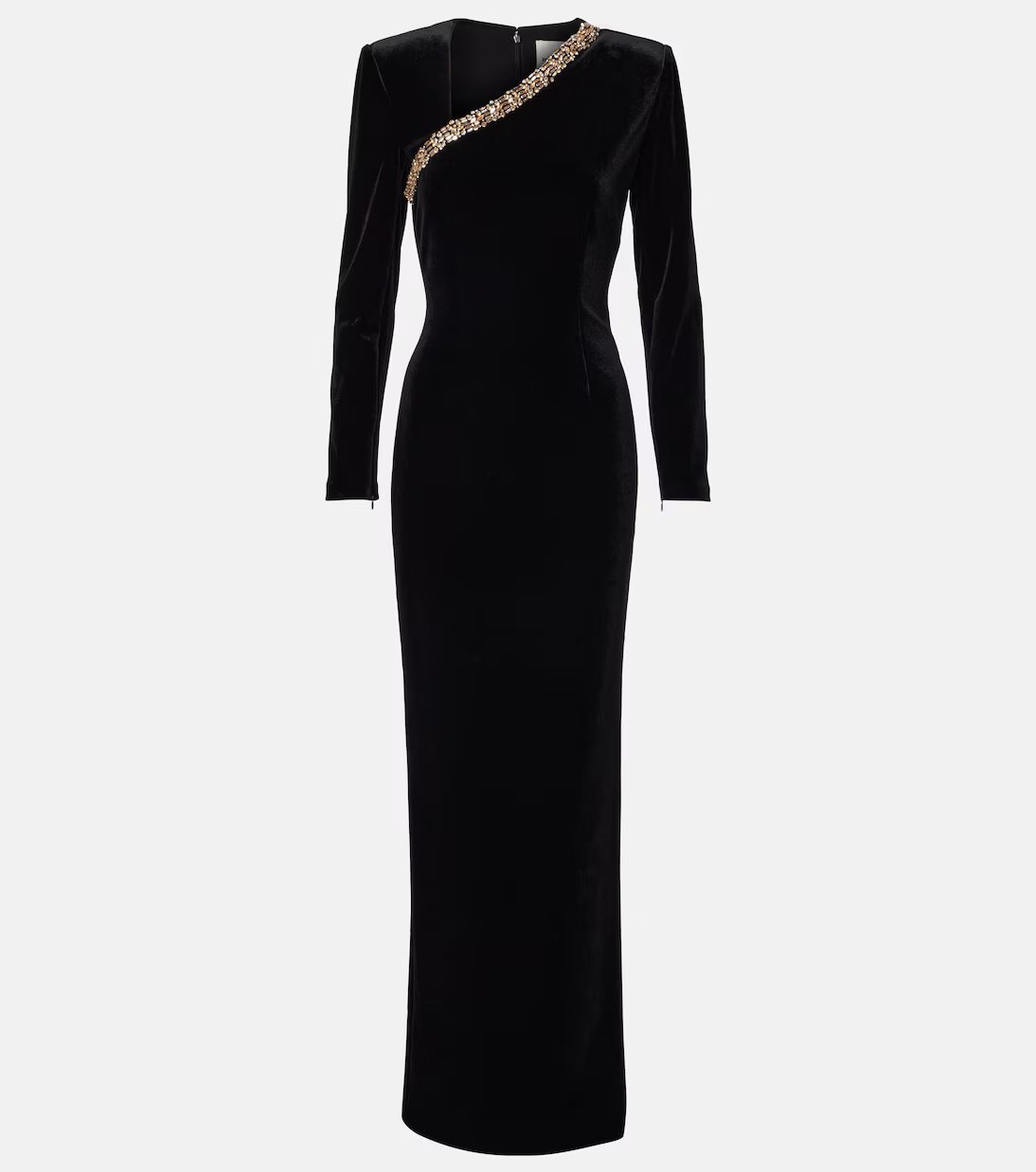 لا تكتمل أجواء الأعياد والمناسبات الشتوية دون اللجوء إلى قماش المخمل. هذا النسيج الغني والفاخر هو المُرادف الحقيقي للدفء والرقي، ويُضفي على الإطلالة عمقاً وملمساً لا مثيل له. تألقي بفستان "نينا ماكسي" من Taller Marmo، المصنوع من المخمل الناعم، يتميز بفتحة رقبة أنيقة بدون أكمام وحواف مزينة بشراشيب جذابة على شكل حرف V. نسقي معه حقيبة "لا كانيت" La Canette الصغيرة بتصميم دلو من علامة Alaïa مصنوعة من جلد السويد، وتتميز بحزام جلدي قابل للتعديل وأجزاء معدنية ذهبية أنيقة. أكملي اللوك بحذاء Jimmy Choo باللون البرغندي، وزيّني الإطلالة بأقراط من Anita Ko مصنوعة من ذهب عيار 18 قيراطًا، ومرصّعة بصفّ من الماسات المستديرة.