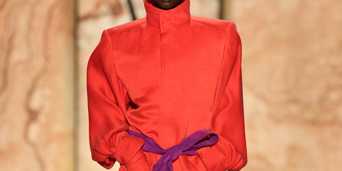 في عرض سان لوران، برز عنصر الدراما من خلال سترة حمراء صارخة بياقة عالية وكتفين عريضين، تجمع بين الأنوثة والعزيمة. تصميم يذكّر بأن الموضة ليست مظهرًا فحسب بل موقف جريء.