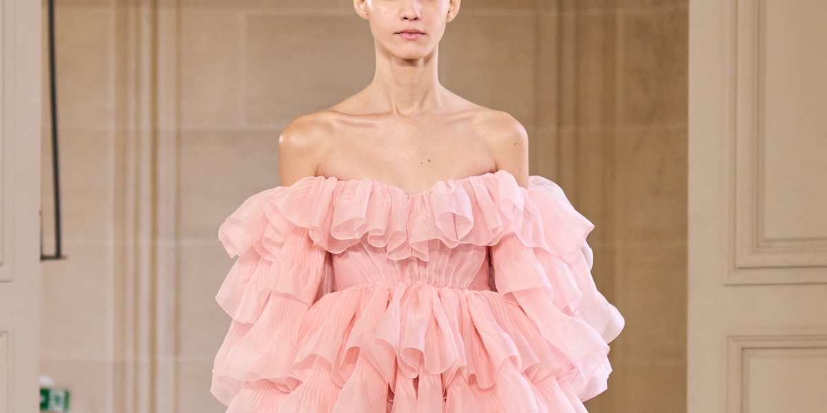 أعادت دار "جيامباتيستا فالي" Giambattista Valli صياغة الرومانسية بأسلوبه المفعم بالحلم، عبر فستان زهري قصير تتراقص فيه الكشاكش بخفةٍ حول الخصر والأكمام. تصميم يفيض أنوثة ومرحًا، ويدعو إلى التمسك بالجمال ببساطةٍ راقية.