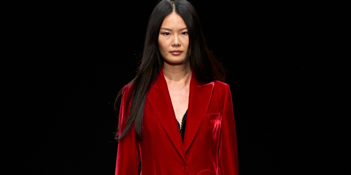 في الصورة الثانية، إطلالة من Ferragamo، نُسق فيها طقم لافت باللّون الأحمر، من جاكيت، مع تنورة قصيرة، وأكسسوارات أحمر أيضاً. لوك جريء، وجذاب، يناسب إطلالاتك الشتوية الأنيقة والشيك.