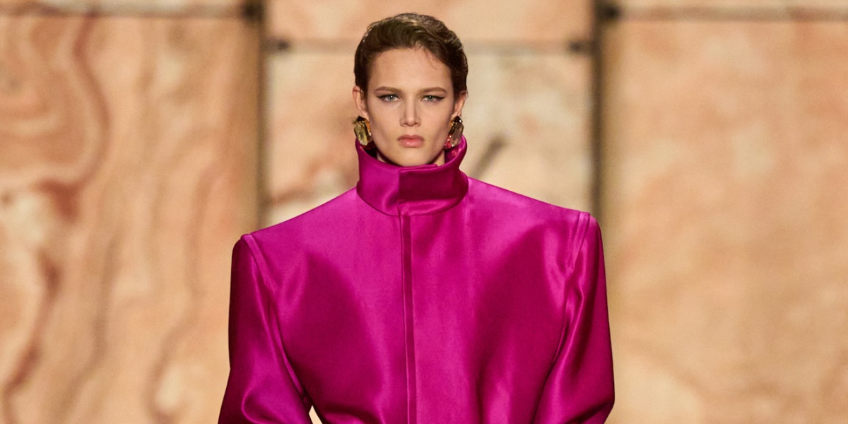 من التصاميم الساتان الرائجة أيضاً، البلايز بالياقات العالية، والتي تكون بالمجمل أيضاً مبطنة في هذا الطقس. هنا نستعرض مثالاً على ذلك، لوك مميّز من Saint Laurent، نُسق فيها بلوزة باللّون الأحمر، بقماش الساتان المبطن، مع تنورة ميدي باللّون البرتقالي. إطلالة عصرية، وجريئة، فيها الكثير من الغلامور أيضاً. إذا كنت من محبي هذه الإطلالات، إعتمديها لهذا الموسم من شتاء 2025 دور تردد.