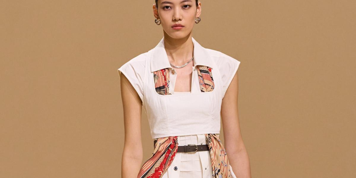 قد يكون الوشاح من أكثر الاكسسوارات التي تضاف إلى الإطلالات الرسمية أو الكلاسيكية البعيدة عن الجرأة، وهو اللمسة الأكثر رقياً في كل الإطلالات أيضاً. وفي ربيع وصيف 2026 اعتمد دار Kallmeyer على الوشاح ليزين الرقبة بشكل غير تقليدي عبر إضافة نوعين من شالات الحرير الناعمة واحد من نفس ألوان الإطلالة  وآخر مخطط بألوان متعدد تضفي لمسة من التغيير على الإطلالة كلها.
