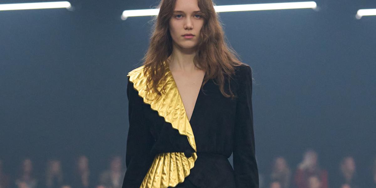 من خلال منصات عروض الأزياء هذا العام، لاحظنا حضوراً قوياً للأقمشة المعدنية والإكسسوارات اللامعة في العديد من دور الأزياء العالمية، مثل Gucci وRoberto Cavalli، حيث ظهرت الفساتين اللامعة، والسترات ذات اللمعان المعدني، وحتى الدنيم بلمسة ذهبية أو فضية. وقد ركّزت بعض المجموعات على الذهب بشكل واضح، مثل مجموعة ربيع وصيف 2026 من Roberto Cavalli التي احتفت بالدرجات الذهبية واللمعان المعدني في الفساتين والإكسسوارات، ما أعاد هذا الاتجاه بقوة إلى واجهة الموضة.
