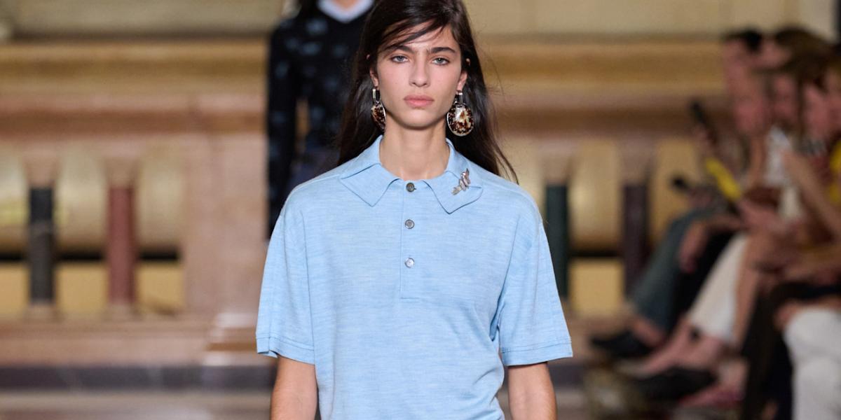 في عروض ميوميو، ظهر قميص البولو بألوان زاهية مثل البرتقالي المائل إلى اليوسفي، وتم تنسيقه مع تنانير ميدي أنثوية وأوشحة مطبوعة عند العنق. هذا التنسيق جمع بين الطابع الرياضي واللمسة الرومانسية، ليمنح الإطلالة أسلوبًا منعشًا ومختلفًا.