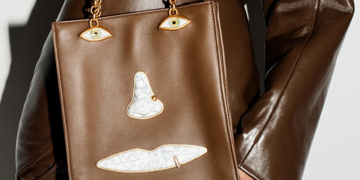 تمتدّ القصة إلى حقيبة The Face الكبيرة الجريئة المصنوعة من جلد العجل الأسود، والمُزيّنة بمجوهراتٍ معدنية مطلية بالمينا تُشكّل وجهًا مُخادعًا بصريًا لافتًا. بتصميمٍ أكثر جرأةً وهندسةً معمارية، تُحوّل هذه الحقيبة الأيقونية إلى رفيقةٍ يوميةٍ تُضفي لمسةً راقية.