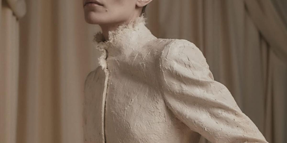 ومن بين القطع المعروضة تصميم جلدي مُشكَّل صُمم خصيصًا للممثلة Jenna Ortega. يعكس هذا العمل اللغة الجمالية التي تميز العلامة، حيث تتحول الخامة الجلدية إلى شكل نحتي يمنح التصميم حضور بصري قوي.