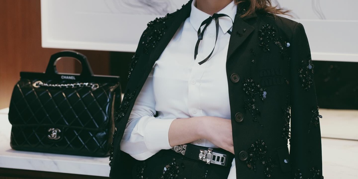 اختارت أسماء إبراهيم طقمًا راقيًا من دار الأزياء العالمية ميو ميو Miu Miu، تألف من جاكيت وتنورة مطرزتين بالترتر الأسود اللامع، مع قميص أبيض مزين بعقدة Bow سوداء أضفت لمسة أنثوية ناعمة على الإطلالة.